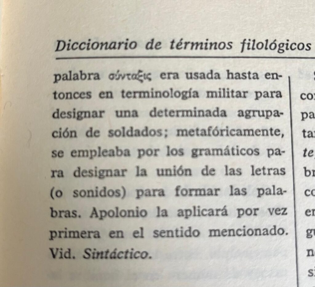 Sintaxis. A. Satzlehre, Wortgefüge. Parte de la Gramática creada por Apolonio Díscolo (s. II d. J. C.) para el estudio de las relaciones que las palabras contraen en la frase. La palabra σύνταξις era usada hasta entonces en terminología militar para designar una determinada agrupación de soldados; metafóricamente, se empleaba por los gramáticos para designar la unión de las letras (o sonidos) para formar las palabras. Apolonio la aplicará por vez primera en el sentido mencionado. Vid. Sintáctico.